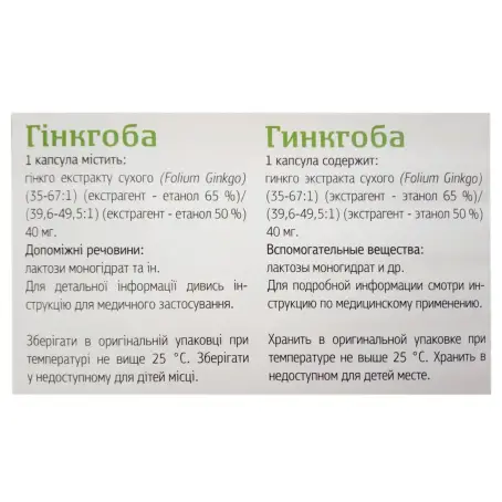 Склад: 1 капсула містить гінкго екстракту сухого (Folium Ginkgo) (35-67:1) (екстрагент - етанол 65%)/(39,6-49,5:1) (екстрагент - етанол 50%) 40 мг (Extractum foliorum Ginkgo biloba (35-67:1))