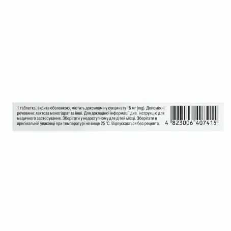 1 таблетка, вкрита оболонкою, містить доксиламіну сукцинату 15 мг;