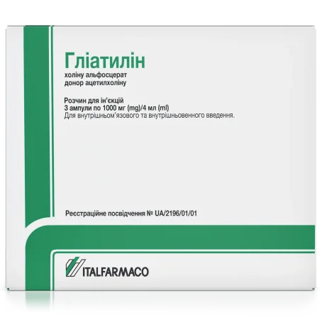 При гострих станах Гліатилін вводити внутрішньомʼязово або внутрішньовенно (повільно) по 1 г (1 ампула) на добу протягом від 15 до 20 днів. Потім, після стабілізації стану хворого, переходити на лікарську форму препарату у капсулах.