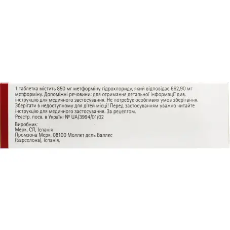 1 таблетка, вкрита плівковою оболонкою, по 850 мг містить 850 мг метформіну гідрохлориду, який відповідає 662,90 мг метформіну;