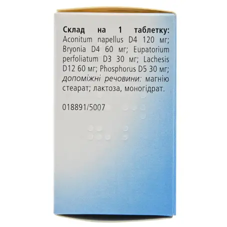 Склад: 1 таблетка містить: Aconitum napellus D4 - 120 мг; Bryonia D4 - 60 мг; Eupatorium perfoliatum D3 - 30 мг; Lachesis D12 - 60 мг; Phosphorus D5 - 30 мг (Aconitum napellus D4)