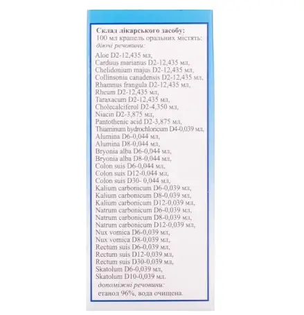 діючі речовини: Aloe D2 – 12,435 мл, Carduus marianus D2 – 12,435 мл, Chelidonium majus D2 – 12,435 мл, Collinsonia canadensis D2 – 12,435 мл, Rhamnus f rangula D2 – 12,435 мл, Rheum D2 – 12,435 мл, Taraxacum D2 – 12,435 мл, Cholecalciferol D2 – 4,350 мл, Niacin D2 – 3,875 мл, Pantothenic acid D2 – 3,875 мл, Thiaminum hydrochloricum D4 – 0,039 мл, Alumina D6 – 0,044 мл, Alumina D8 – 0,044 мл, Bryonia alba D6 – 0,044 мл, Bryonia alba D8 – 0,044 мл, Colon suis D6 – 0,044 мл, Colon suis D12 – 0,044 мл, Colon suis D30 – 0,044 мл, Kalium carbonicum D6 – 0,039 мл, Kalium carbonicum D8 – 0,039 мл, Kalium carbonicum D12 – 0,039 мл, Natrum carbonicum D6 – 0,039 мл, Natrum carbonicum D8 – 0,039 мл, Natrum carbonicum D12 – 0,039 мл, Nux vomica D6 – 0,039 мл, Nux vomica D8 – 0,039 мл, Rectum suis D6 – 0,039 мл, Rectum suis D12 – 0,039 мл, Rectum suis D30 – 0,039 мл, Skatolum D6 – 0,039 мл, Skatolum D10 – 0,039 мл .