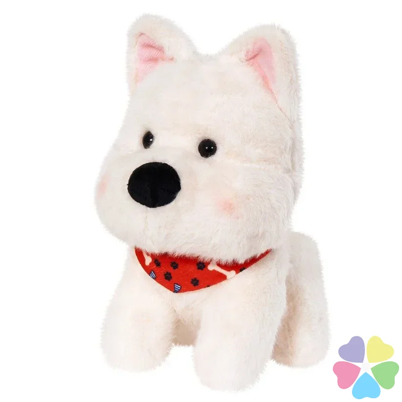 Собачка Лакі - це милий компаньйон з м'якого плюшу, доступний у двох кольорах. Він носить червону бандану, яка надає йому грайливого та доброзичливого вигляду, і ідеально підходить для обіймів, ігор або прикраси.