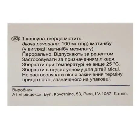 1 капсула містить іматинібу мезилату 119,5 мг 478 мг, що еквівалентно іматинібу 100 мг або 400 мг