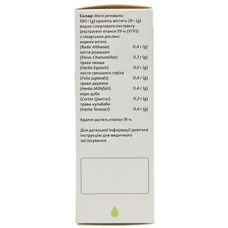 Склад: 100 г крапель містять 29 г водно-спиртового екстракту (екстрагент етанол 59% (об/об)) з лікарських рослин: кореня алтею (Radix Althaeae) 0,4 г; квітів ромашки (Flores Chamomillae) 0,3 г; трави хвоща (Herba Equiseti) 0,5 г; листя грецького горіха (Folia Juglandis) 0,4 г; трави деревію (Herba Millefolii) 0,4 г; кори дуба (Cortex Quercus) 0,2 г; трави кульбаби (Herba Taraxaci) 0,4 (Radix Althaeae officinalis)