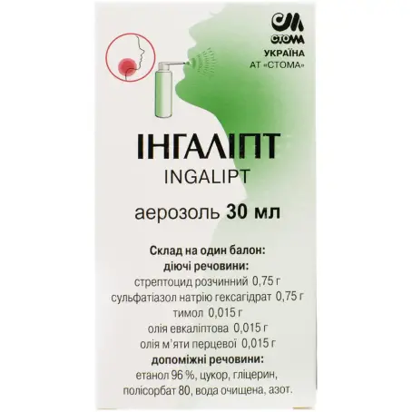 діючі речовини: 1 балон (30 мл) містить стрептоциду розчинного 0,75 г; сульфатіазолу натрію гексагідрату 0,75 г; тимолу 0,015 г; олії евкаліптової 0,015 г; олії м'яти перцевої 0,015 г;