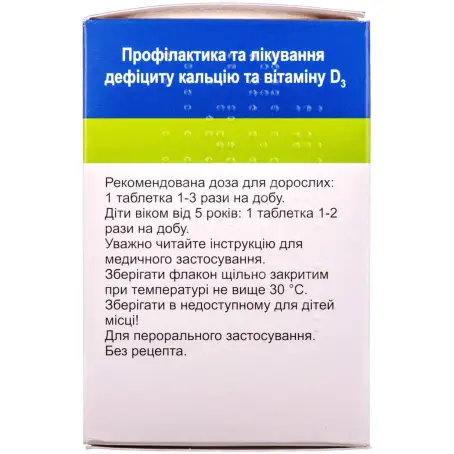 Склад: 1 таблетка містить кальцію карбонату 1250 мг, що еквівалентно 500 мг кальцію, холекальциферолу (вітаміну D3) - 5 мкг (200 МО), що відповідає холекальциферолу концентрату* 2 мг/*Склад холекальциферолу концентрату: холекальциферол, DL--токоферол, тригліцериди середнього ланцюга, крохмаль кукурудзяний модифікований, сахароза, натрію аскорбат, кремнію діоксид колоїдний безводний (Calcii carbonas)