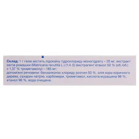 діюча речовина:1 г гелю містить лідокаїну гідрохлориду моногідрату - 20 мг, екстракт квітів ромашки (Matricaria recutita L.) (1:4-5) (екстрагент етанол 50% (об./об.) з 1,37% трометамолу) - 185 мг;