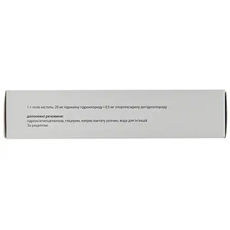 Склад: 1 г гелю містить 20 мг лідокаїну гідрохлориду і 0,5 мг хлоргексидину дигідрохлориду (CHLORHEXIDINI DIHYDROCHLORIDUM)