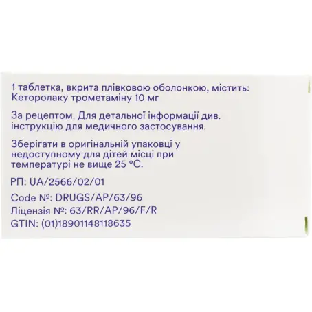 Склад: 1 таблетка, вкрита плівковою оболонкою, містить кеторолаку трометаміну 10 мг; (KETOROLACI TROMETAMINUM)
