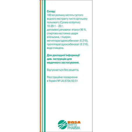 Склад: 100 мл розчину містять густого водного екстракту листя артишоку польового (Cynara scolymus) 10-20:1 - 20 г/ (Extractum aquaticum spissum ex folii Cynarae scolumus)