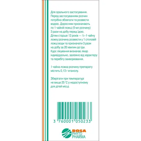 Дітям віком від 12 років - ½-1 чайну ложку розчину розвести у 1 столовій ложці води та приймати 3 рази на добу за 20 хвилин до їди.