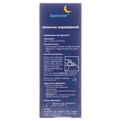 Склад: Полісорбат 80, гліцерин 85%, хлорид натрію, натрію едетат, вода очищена, сорбат калію 0,15%. Упаковка: Спрей для носа Храпсон, 30 мл. Розрахована на 1 місяць.