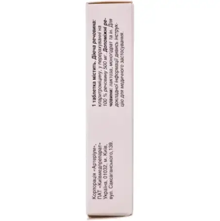 Лікування. Побічні реакції, що супроводжують передозування, слід лікувати за допомогою промивання шлунка та симптоматичної терапії. Як і у випадку з іншими макролідами, малоймовірно, щоб гемодіаліз або перитонеальний діаліз суттєво впливали на вміст кларитроміцину в сироватці крові.