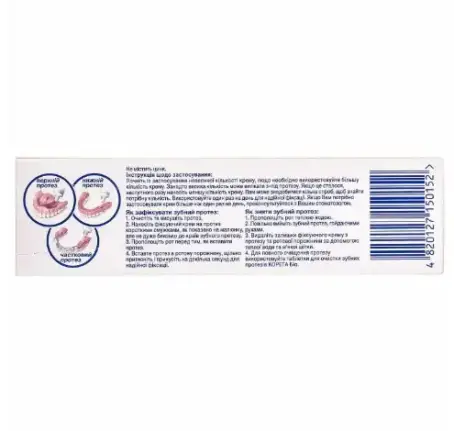 ОсобливостіКрем запобігає зміщенню протеза в порожнині рота і потрапляння частинок їжі навіть в добре прилеглий протез, захищаючи слизову від подразнення.