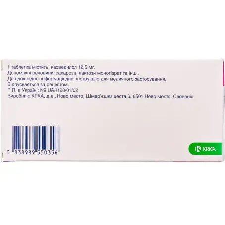 Склад: 1 таблетка містить карведилолу 12,5 мг (Carvedilolum)