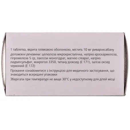 Склад: 1 таблетка, вкрита плівковою оболонкою, містить 10 мг ривароксабану (Rivaroxabanum)