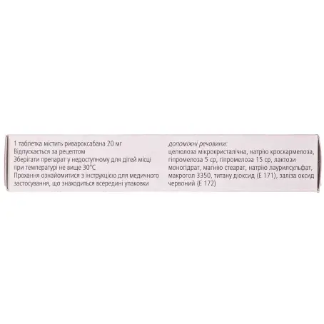 Склад: 1 таблетка, вкрита плівковою оболонкою, містить 20 мг ривароксабану (Rivaroxabanum)