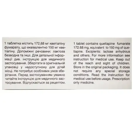 1 таблетка містить 57,56 мг або 172,68 мг або 345,36 мг кветіапіну фумарату, що еквівалентно 50 мг або 150 мг або 300 мг кветіапіну;