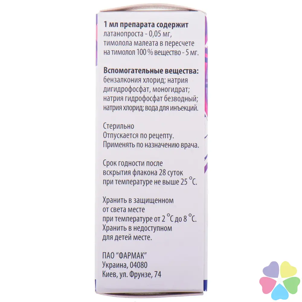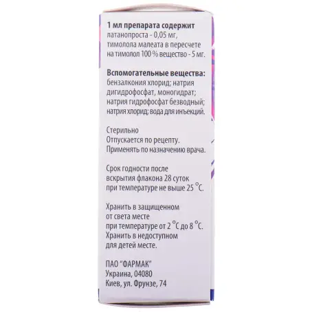 Склад: 1 мл препарату містить латанопросту 0,05 мг, тимололу малеату в перерахуванні на тимолол 100% речовину 5 мг (Latanoprostum)