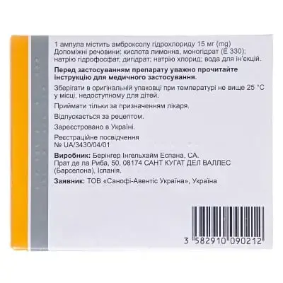 Склад: 1 ампула містить амброксолу гідрохлориду 15 мг (AMBROXOLI HYDROCHLORIDUM)