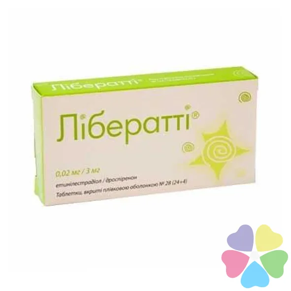 Лікарський засіб Лібератті® - це комбінований пероральний контрацептив з етинілестрадіолом та прогестогеном дроспіреноном. У терапевтичних дозах дроспіренон проявляє антиандрогенні та помірні антимінералокортикоїдні властивості. Він не має естрогенної, глюкокортикоїдної та антиглюкокортикоїдної активності. Отже, дроспіренон має схожий фармакологічний профіль з природним прогестероном.