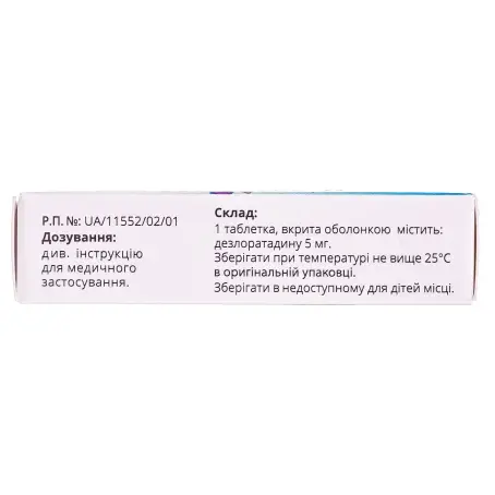 Склад: 1 таблетка містить дезлоратадину 5 мг (Desloratadinum)