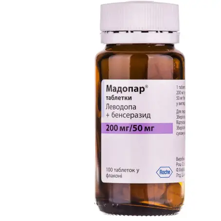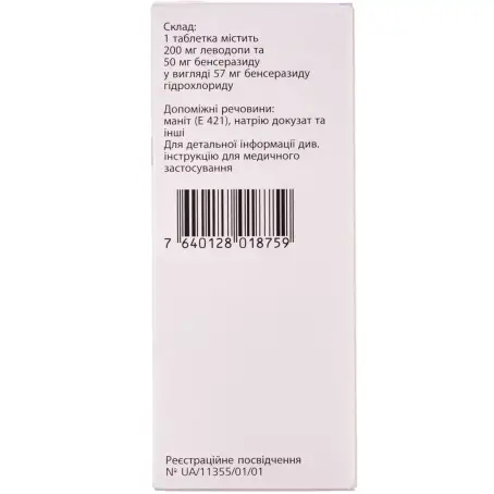 Склад: 1 таблетка містить леводопи 200 мг та бенсеразиду 50 мг у формі бенсеразиду гідрохлориду 57 мг (LEVODOPUM)