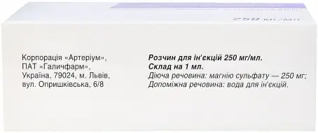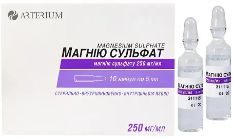 Раствор Магния сульфат 250 мг/мл – вазодилатирующее средство для парентерального введения. Оказывает токолитическое, спазмолитическое, антигипертензивное, антиаритмическое, противосудорожное действие, угнетает нервно-мышечную передачу, подавляет дыхательный центр.