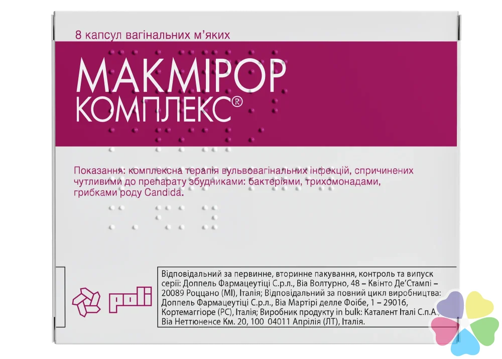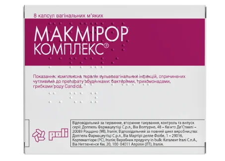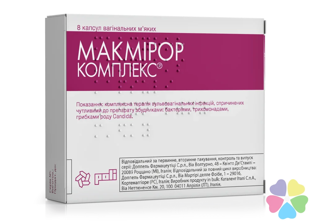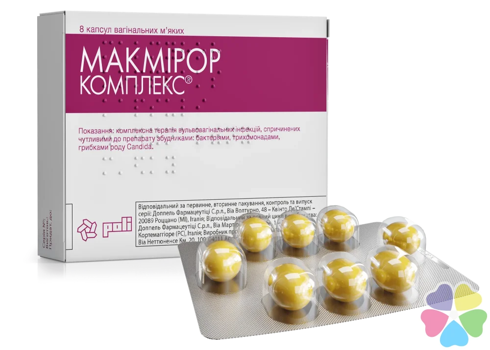 У лікарському препараті МАКМІРОР КОМПЛЕКС поєднано діючі речовини ніфуратель і ністатин. Ніфуратель - це хімічна лікарська речовина, синтезована науково-дослідною лабораторією POLI, здатна ефективно знищувати трихомонади, бактерії і грибкові мікроорганізми.