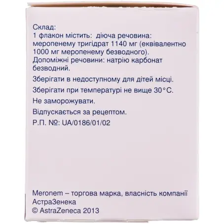 Склад: 1 флакон містить: меропенему тригідрат 1140 мг (еквівалентно 1000 мг меропенему безводного) (MEROPENEMUM)