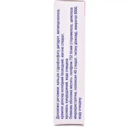допоміжні речовини: кальцію гідрофосфату дигідрат, метилцелюлоза, кремнію діоксид колоїдний безводний, магнію стеарат, крохмаль кукурудзяний, вода очищена;