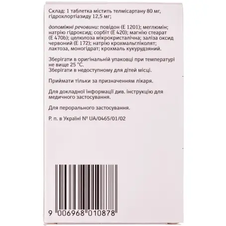 Склад: 1 таблетка містить телмісартану 80 мг та гідрохлортіазиду 12,5 мг (Telmisartanum)