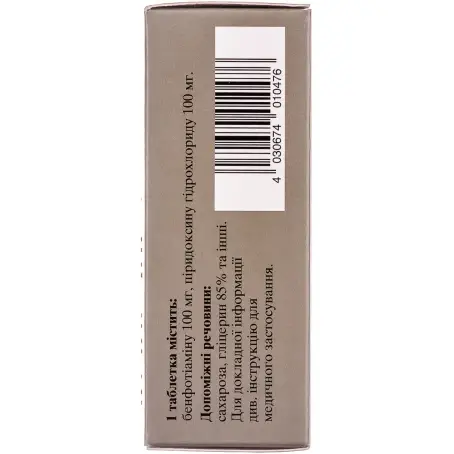 Склад: 1 таблетка містить: бенфотіаміну 100 мг, піридоксину гідрохлориду 100 мг (Benphothiaminum)