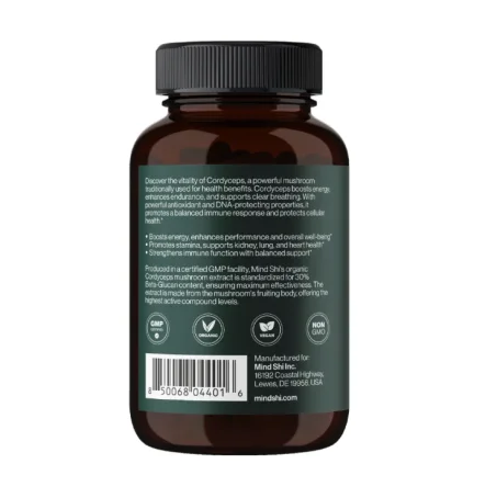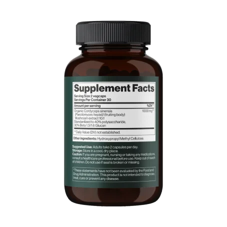 Кордицепс зміцнює імунну систему, підтримує функціонування дихальної системи, підвищує витривалість, покращує енергетичний баланс, допомагає боротися зі втомою, підтримує обмін речовин, сприяє кращому засвоєнню поживних речовин, покращує функціонування серцево-судинної системи, забезпечує оптимальну циркуляцію крові, підтримує фізичну активність, сприяє загальному тонусу організму.
