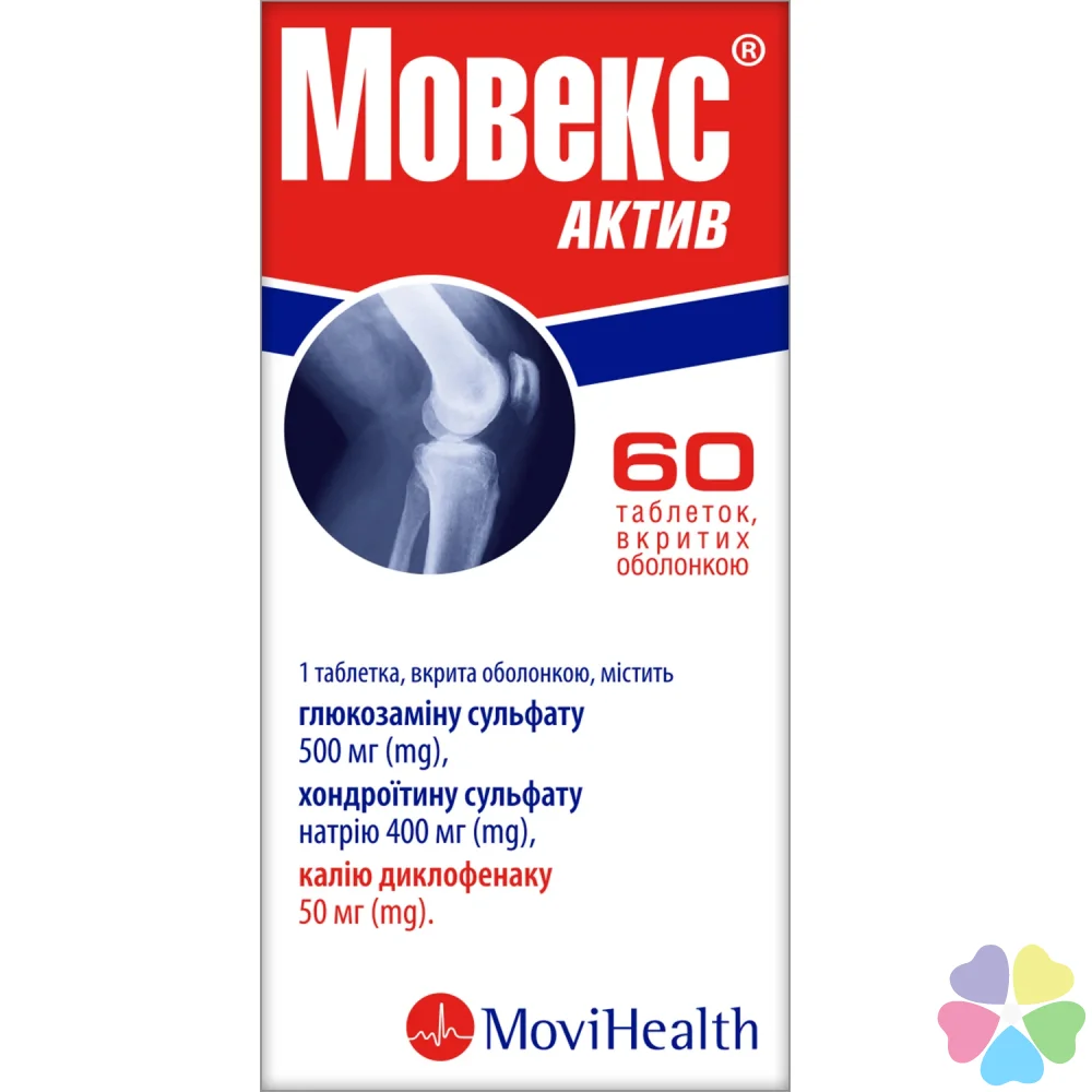 Складдіючі речовини мовекс актив: 1 таблетка вкрита оболонкою містить глюкозаміну сульфату 500 мг хондроїтину сульфату натрію 400 мг калію диклофенаку 50 мг;