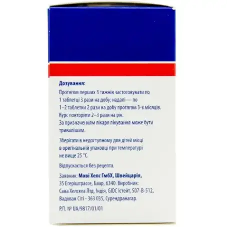 1−2 таблетки 2 рази на добу протягом 3-х місяців. Курс повторити 2−3 рази на рік.