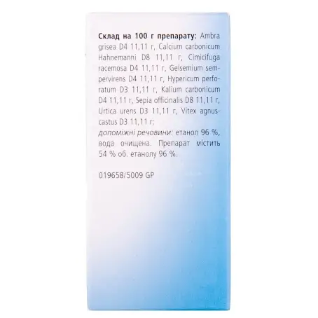діючі речовини: 100 г препарату містять: Ambra grisea D4 - 11,11 г, Calcium carbonicum Hahnemanni D8 - 11,11 г, Cimicifuga racemosa D4 - 11,11 г, Gelsemium sempervirens D4 - 11,11 г, Hypericum perforatumD3 - 11,11 г, Kalium carbonicum D4 - 11,11 г, Sepia officinalis D8 - 11,11 г, Urtica urens D3 - 11,11 г, Vitex agnus-castusD3 - 11,11 г;