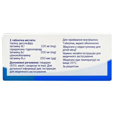 Склад: 1 таблетка, вкрита оболонкою, містить: тіаміну дисульфід (вітаміну В1) 100 мг, піридоксину гідрохлорид (вітаміну В6) 200 мг, ціанокобаламін (вітаміну В12) 240 мкг (Thiaminum disulfide)