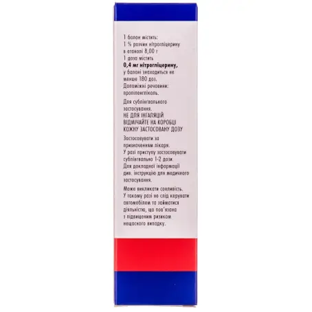 Склад: 1 балон містить 1% розчину нітрогліцерину в етанолі 8 г, що відповідає нітрогліцерину 0,08 г; /1 доза містить 0,4 мг нітрогліцерину (Solutio nitroglycerini 1%)