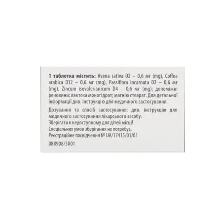 Діюча речовина: 1 таблетка містить: Avena sativa D2 - 0,6 мг, Coffea arabica D12 - 0,6 мг, Passiflora incarnata D2 - 0,6 мг, Zincum isovalerianicum D4 - 0,6 мг.