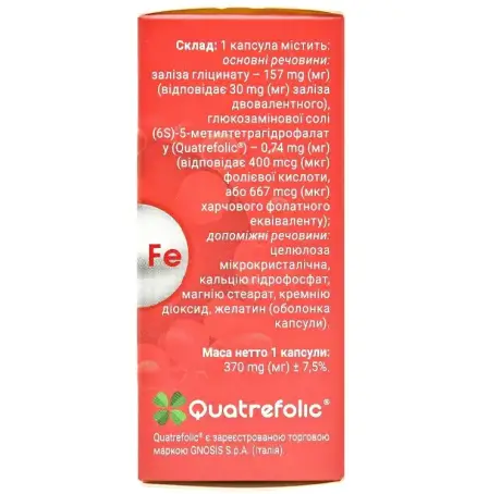 основні речовини: заліза гліцинат - 143 mg (мг) (відповідає 30 mg (мг) заліза двовалентного), глюкозамінової солі (6S) -5-метилтетрагідрофалат (Quatrefolic®) - 0,88 mg (мг) (відповідає 400 mcg (мк) фолієвої кислоти, або 667 mcg (мкг) харчового фолатного еквівалента);