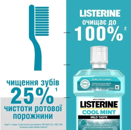 Listerine Свіжа м'ята - це ополіскувач для порожнини рота на кожен день, ефективність якого клінічно доведена.