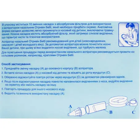 Отривін Бебі Змінні насадки для аспіратора. Запасна упаковка з 10 безпечними і гігієнічними назальними наконечниками для використання з назальнии аспіратором Отривін Бебі. Змінні насадки для аспіратора Отривін Бебі розроблені спеціально для маленьких, чутливих носиків і роблять процедуру аспірації для дитини і матері безпечною. Використання одноразових насадок захищає немовля і батьків від інфекцій і позбавляє від необхідності стерилізувати пристрій. Крім того, структура насадки виключає ризик раптового попадання слизу назад в порожнину носика.