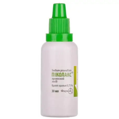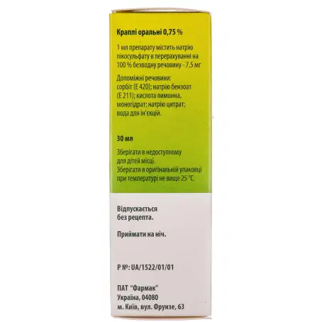 Склад: 1 мл препарату містить натрію пікосульфату у перерахуванні на 100% безводну речовину 7,5 мг (20 крапель) (Natrii picosulfatum)