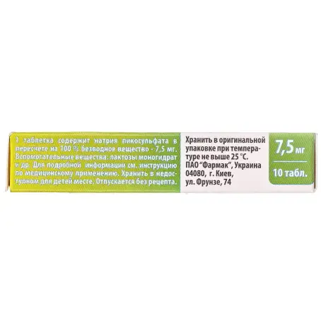 Склад: 1 таблетка містить натрію пікосульфату у перерахуванні на 100% безводну речовину 7,5 мг (Natrii picosulfatum)