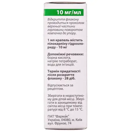Склад: 1 мл розчину містить пілокарпіну гідрохлориду 10 мг (PILOCARPINUM)