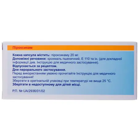 Склад: 1 капсула містить піроксикаму 20 мг (PIROXICAMUM)