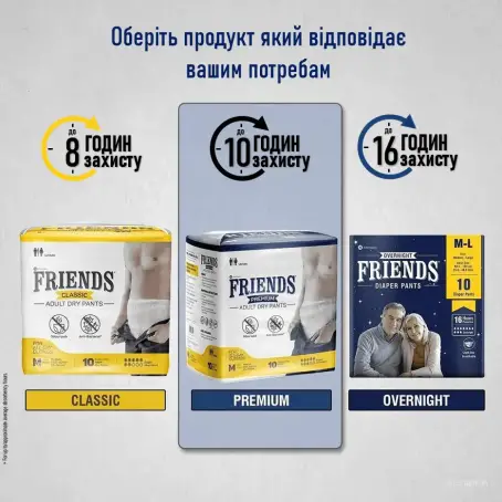 Friends Premium та Overnight - це зручні у використанні підгузники у формі трусів для дорослих. Підгузники розроблені для боротьби з помірним і сильним витоком сечі як у чоловіків, так і у жінок, виготовлені з високоякісних матеріалів, є надзвичайно абсорбуючими, негерметичними та зручними для носіння протягом усього дня.