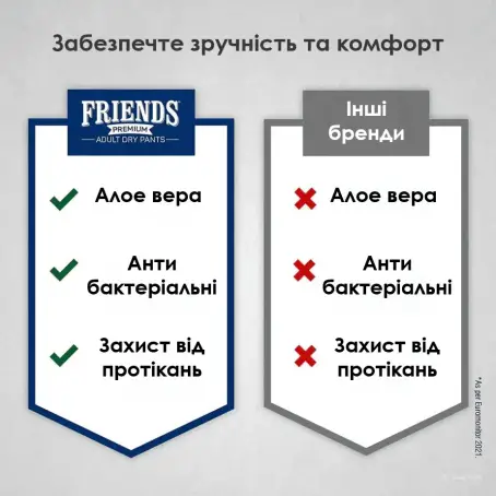 Підгузники-труси для дорослих Friends Premium та Friends Overnight, ніжні до шкіри, мають чудову поглинаючу здатність, надійно захищають від протікань зі спини чи боків.